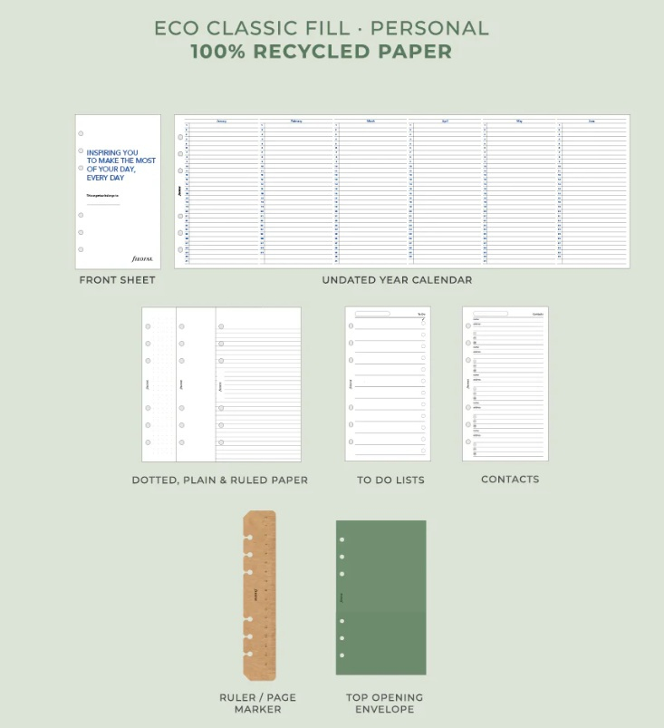 Obal z umělé kůže je vyroben ze 100% spotřebitelského recyklovaného plastu s decentní texturou zrnité kůže. Uvnitř najdete náplň Eco Classic s FSC certifikovaným 80g papírem, který je vhodný i pro plnicí pera. Výměnný obsah zahrnuje kalendář, poznámkové listy, úkoly, kontakty i praktické pravítko a záložku. Velikost náplně Personal - formát papíru 95 x 171 mm.