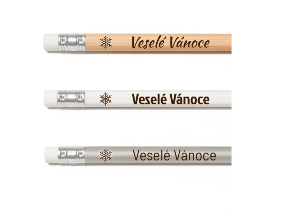 Drevená grafitová ceruzka s lakovaným telom, gumou a vygravírovanou vločkou. Tvrdosť HB. V cene je aj vygravírovanie vlastného nápisu alebo loga. Rozmery ceruzky sú 7 x 190 mm.