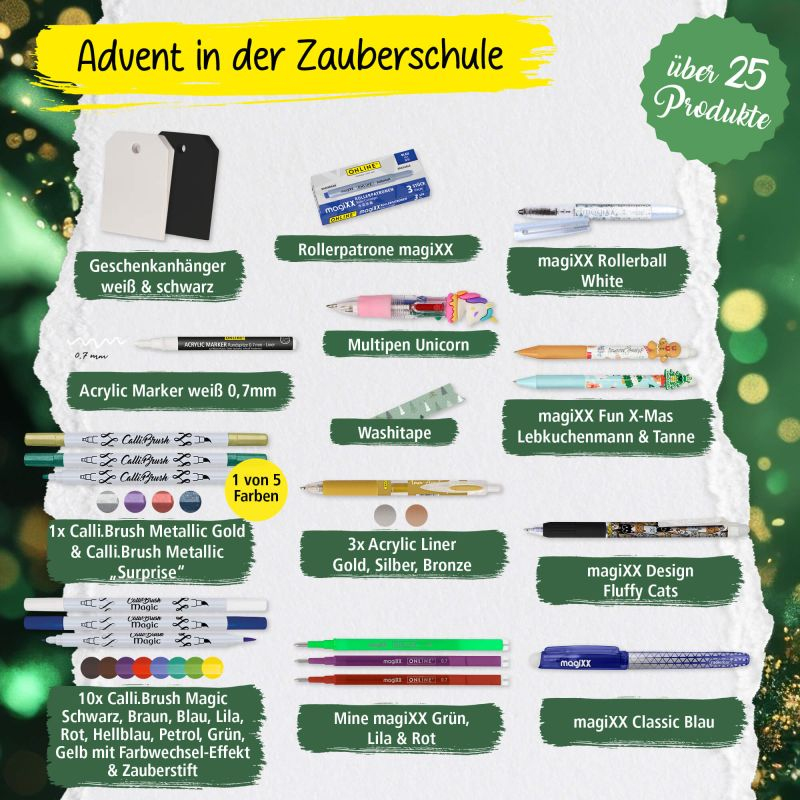 Kalendár vytvára atmosféru kúzelníckej školy, kde namiesto paličiek vládnu magické fixky a perá. Vnútri nájdete všetko, čo nadšené srdce kreatívca môže potrebovať – vymazávacie gélové perá, Calli.Brush Magic fixy, akrylové popisovače, washi pásku aj darčekové visačky. Ideálna základná výbava pre kaligrafiu, kreslenie, bullet journaling alebo písanie listov plných fantázie.
