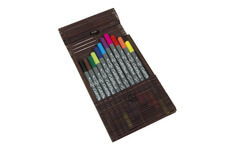 Sada 11 kaligrafických obojstranných fixiek - s kaligrafickým 2 mm hrotom na jednej strane, ktorý je ideálny pre presné línie. A s flexibilným štetcom na druhej strane, ktorý je ideálny pre kreatívne nápisy. Atrament je na vodnej báze, bez toxických pigmentov. Dodávané v krásnom bambusovom boxe.