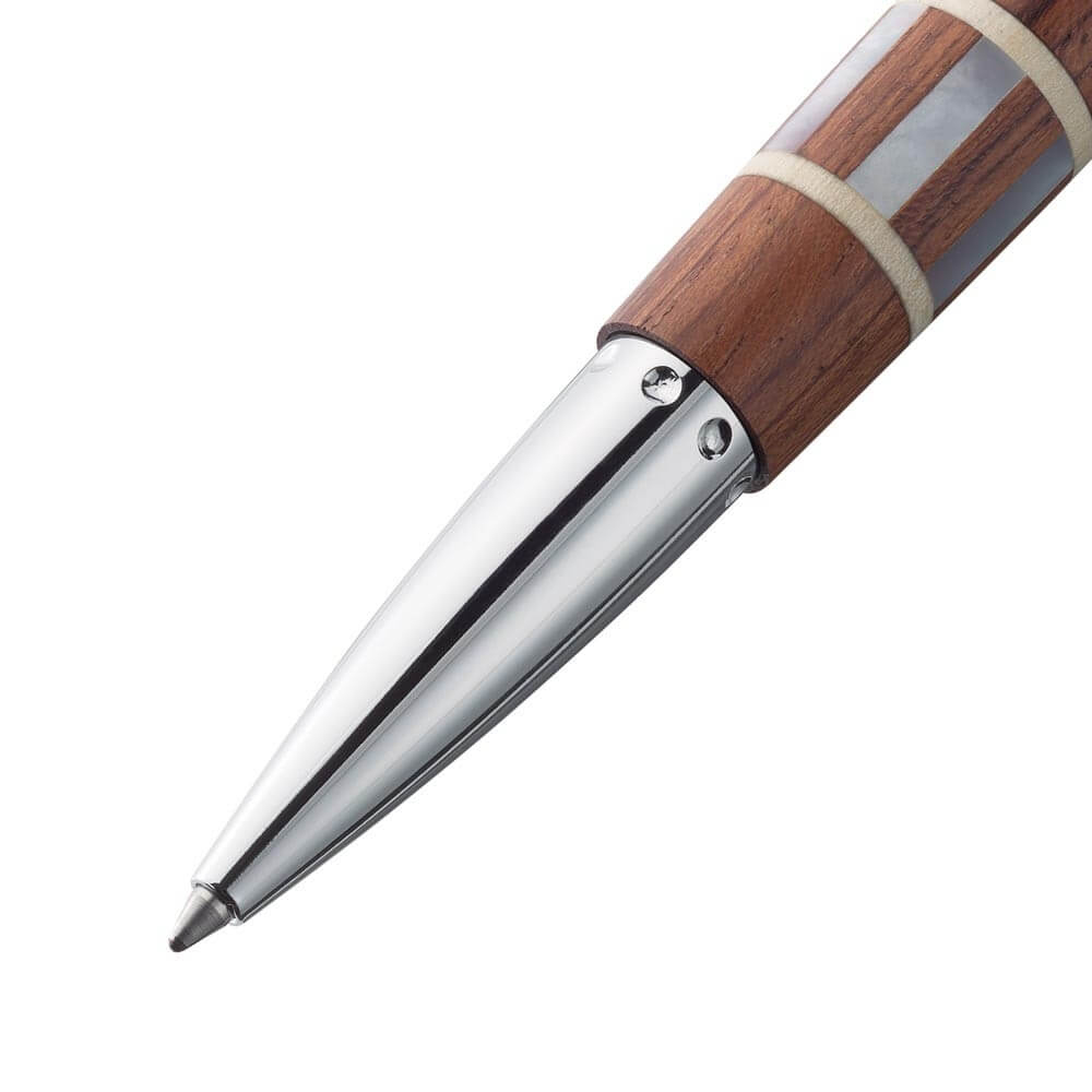 Rose n Pearls - to je rafinované palisandrové drevo, dieliky z perlorodky Pinctada Maxima a krúžky z javorového dreva - tri cenné poklady prírody. Všetko je skĺbené do citlivej súhry. Z tohto pera, ktoré oslnia aj tie najnáročnejšie, je cítiť charizma, teplo a pocit, že len príroda vie vytvoriť najrafinovanejšie klenoty.