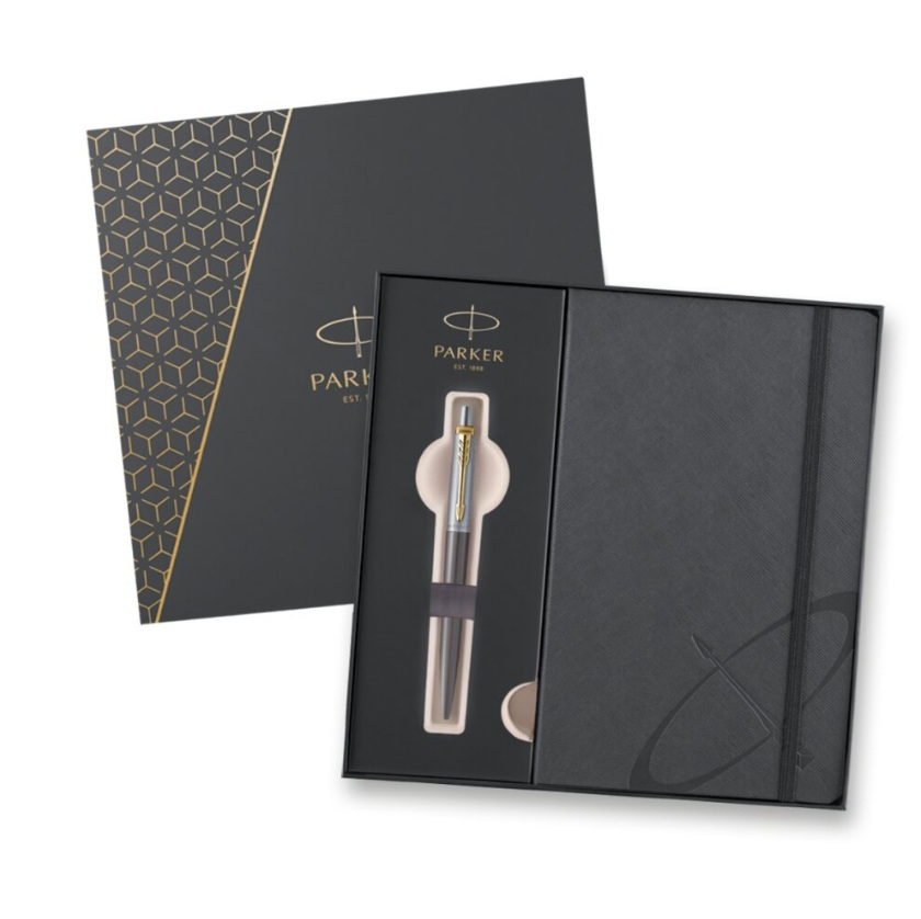 Sada kuličkového pera Parker Jotter XL Core Grey GT, zápisníku a voucheru Akademie psaní v dárkové kazetě.