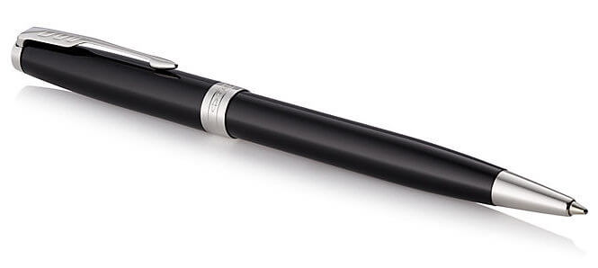 Guľôčkové pero Parker Royal Sonnet Black CT má lesklo čierne lakované mosadzné telo a viečko. Doplnky sú pokovované paládiom. Otočný mechanizmus pre vysunutie veľkokapacitné náplne. Dodávané v elegantnej darčekovej krabičke. Vyrobené vo Francúzsku.