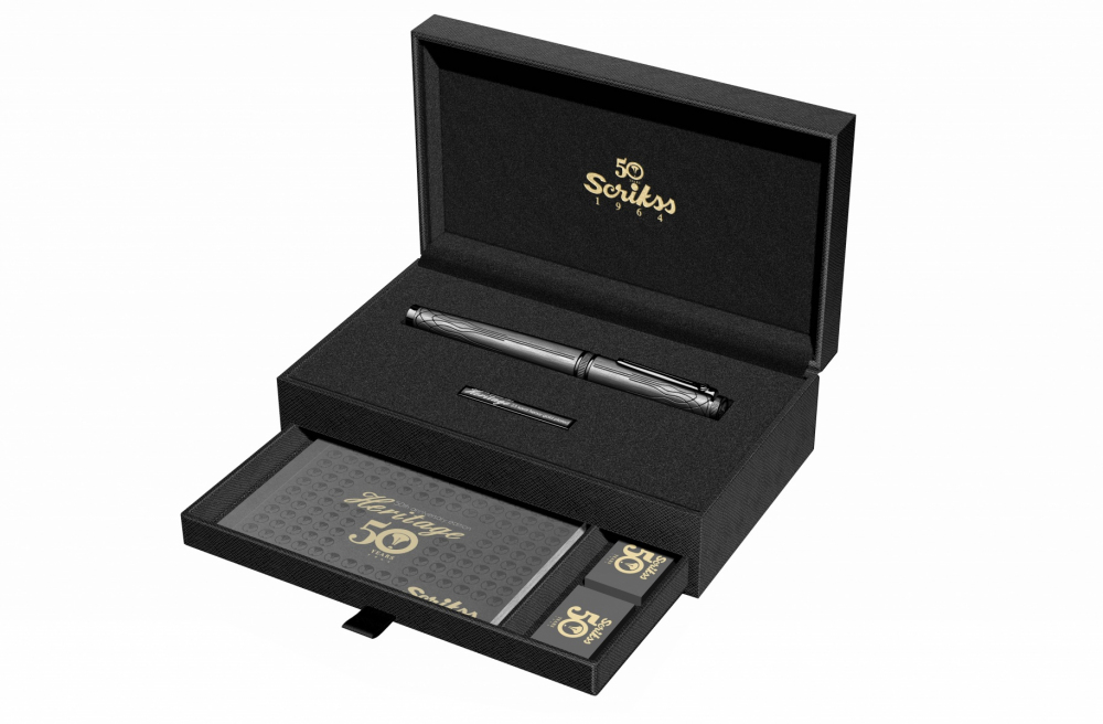 Masívne plniace pero Scrikss Heritage Matt Black v časovo limitovanej edícii vydanej k príležitosti 50. rokov značky Scrikss, čo je turecká značka špecializujúca sa na výrobu luxusných písacích potrieb a doplnkov. Kovové telo pera je potiahnuté pomocou techniky PVD odolnou matne čiernou vrstvou. Klip a doplnky sú čiernenie. Prvotriedny hrot šírky M (stredný) je vyrobený z nerezovej ocele a je potiahnutý čiernou farbou. Viečko je skrutkovacie. Perfektné vyváženie pre pohodlný pocit pri písaní.