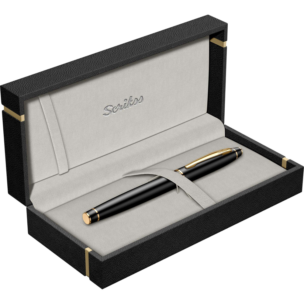 Elegantné plniace pero Scrikss Noble s mosadzným telom a viečkom lakovaným viacvrstvovým matne čiernym lakom. Doplnky a klip sú pozlátené 23 karátovým zlatom. Hrot s irídiovou špičkou je vyrobený z leštenej nerezovej ocele a tiež pozlátený. Je v ponuke iba v šírke M - strednej. Viečko je nasadzovacie. Pero je vybavené systémom na bombičky aj na plnenie konvertorom. Súčasťou balenia je konvertor a 2 modré bombičky. Dodávané v darčekovej krabičke.