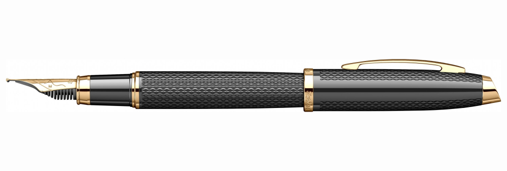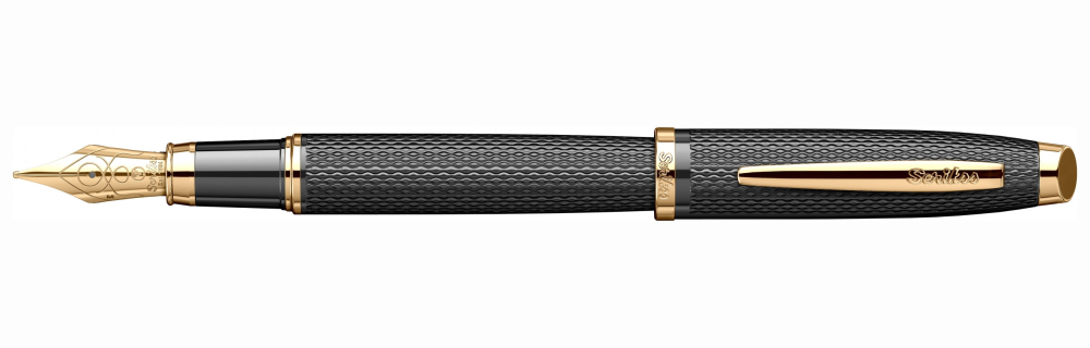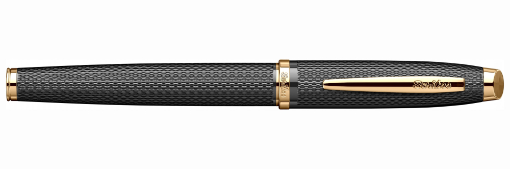 Zaujme matně černým kovovým tělem s unikátním vlnkovým vzorem, která dodává peru charakter a zároveň zajišťuje pevný a pohodlný úchop. Pozlacené kovové doplňky a pružný klip z nerezové oceli podtrhují jeho luxusní vzhled.