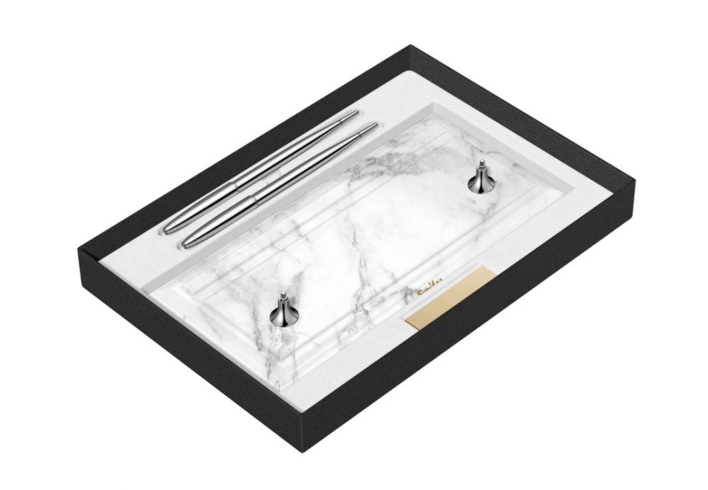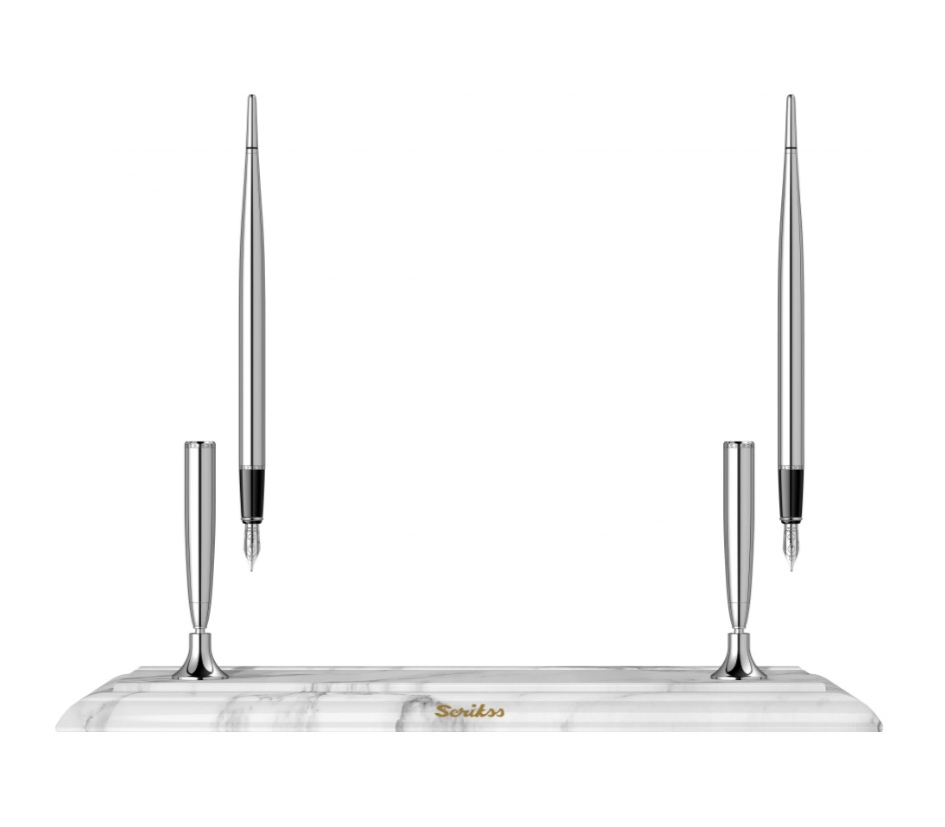 Elegantný a moderný stolný set plniacich pier so základňou z bieleho mramoru. Perá sú vyrobené z mosadze a pokovované chrómom. Majú nerezový hrot pokovovaný chrómom s irídiovou špičkou v šírke M - strednej.